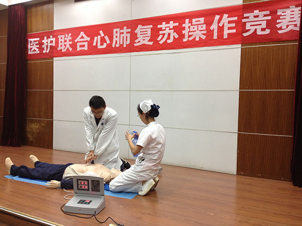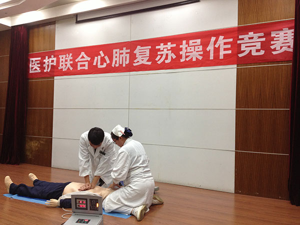 “喂!喂!你怎么了?你怎么了?”“病人瞳孔散大,呼吸心跳骤停,需要马上抢救!快来人啊!救命啊!”随着一位护士的呼叫声,一名医生冲到患者身旁,跪立在“患者”旁边,紧急进行胸外心脏按压……这是江原医院“医护联合心肺复苏操作竞赛”上的一幕。