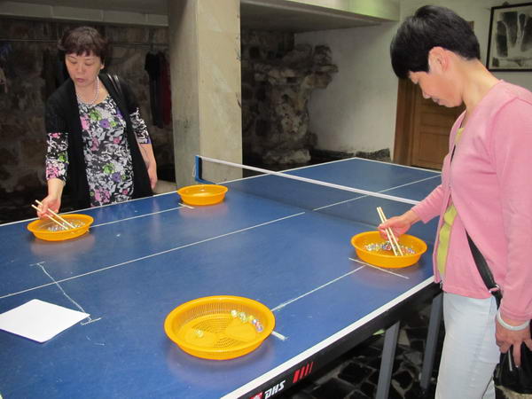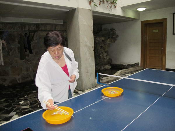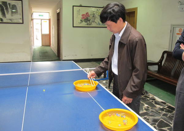 根据省厅老体协关于运动会比赛要求,针对老年人的兴趣爱好,结合老同志身体情状况以及前期报名情况,此次选拔赛共设置了5项集趣味性、娱乐性、竞技性为一体的比赛项目,分为室内室外两组,室内组为竹筷挟弹子、飞镖2项;室外组为羽毛球传球、篮球投篮、简易保龄球3项。竹筷挟弹子讲求技巧与平衡,飞镖要求精准和力度,羽毛球传球需要配合默契,篮球投篮则要有经验与手感。简易保龄球非常有趣,10个可乐瓶加1个四号足球就组成了简易的保龄球装备,因地制宜,又免去了老同志们去保龄球馆的奔波,但同样可以达到相当的锻炼效果。老同志们看着这些既适合老年人活动又十分有趣的项目,个个精神饱满、兴致勃勃、跃跃欲试,全身心地投入到每一个项目选拔当中,认真做好每一个动作,不甘落后。比赛中,大家相互交流动作技巧,畅谈健身体会。