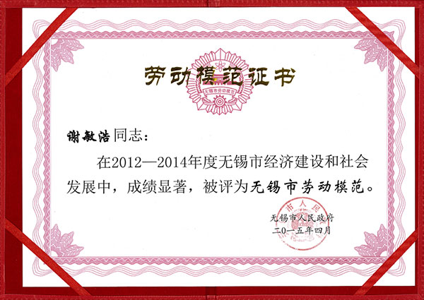 谢敏浩被无锡市人民政府评为2012-2014年度无锡市劳动模范。