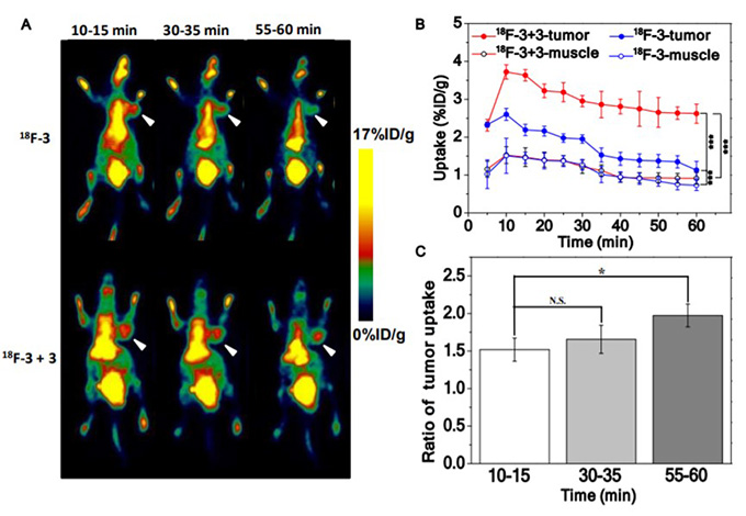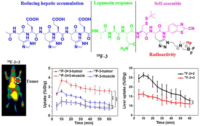 在上述实验基础上,研究团队还进行了引入标记和共注射策略的优化实验:通过在探针18F-3中引入三组组氨酸-谷氨酸亲水肽链(HE)3标记,显著减少肝脏蓄积,而不影响肿瘤摄取;采用共注射策略(18F-2 + 2和18F-3+ 3)使肿瘤摄取显著增加,信噪比显著提高。结果表明,探针18F-3对监测天冬酰胺内肽酶在肿瘤中的表达水平具有良好的特异性与灵敏度,对天冬酰胺内肽酶过表达相关的疾病在早期发现与疗效监测方面具有较好的应用潜力。(创新药物研究中心)