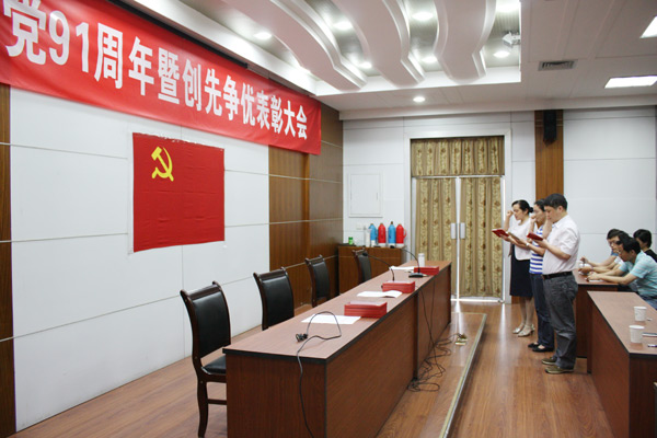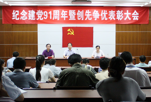 在庆祝建党91周年之际,所党委于6月28日下午,在所阶梯教室召开纪念建党91周年暨创先争优表彰大会。大会全面总结了2010年以来我所创先争优系列活动取得的经验和成果;进行了新党员入党宣誓仪式;表彰了在创先争优活动中涌现出的先进个人;对6位先进个人的事迹进行了宣讲。大会由所党委副书记、纪委书记秦秋萍主持,所长罗世能,副所长包建东、谢敏浩出席了会议,全体在职党员和入党积极分子参加大会。