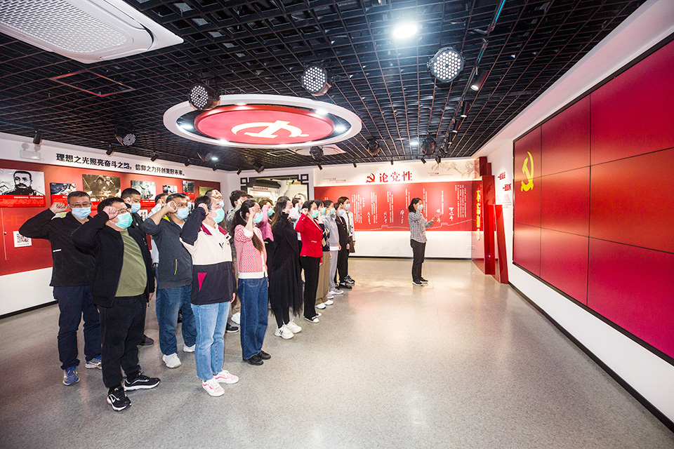 活动的第一站是惠山古镇党性检视中心参观学习,该中心是集党史学习教育、党建文化展示、党性检视教育于一体,融合家风家训特色文化的党性教育基地。进入中心,首先映入眼帘的是一面幕墙,上面醒目地印着习近平总书记关于党性修养的重要论述“党性是党员立身、立业、立言、立德的基石,必须在严格的党内生活锻炼中不断增强”。在“一艘红船的故事”的讲解声中,支部党员们开启了党性检视之旅。大家通过讲解员陈述、图片展板展示、触屏点击互动,深入了解了习近平新时代中国特色社会主义思想、中国共产党党史、新时期共产党员的党性修养以及党建工作的特色亮点和创新举措,加深了对“以伟大建党精神为源头的中国共产党人精神谱系”的理解;通过照镜正容、答题叩问初心、触屏访姓氏流源、学习强国线下课堂等沉浸式、互动式教育,进行了自我检视,初心洗礼。最后,在中心的赤诚厅,党支部书记带领大家面向鲜红党旗重温入党誓词,用铿锵有力的誓言激励自己牢记初心使命、砥砺奋进前行。