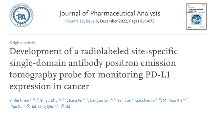近日,我所创新药物研究中心团队在学术期刊《Journal of Pharmaceutical Analysis》(IF:14.026)上发表《PD-L1靶向单域抗体PET分子探针的定点标记及成像应用》一文。本研究利用单域抗体CDV-Nb109中特定氨基酸中的巯基特异性定点偶联双功能螯合剂Maleimide-NODA,成功制得结构均一的PD-L1靶向PET探针68Ga-NODA-CDV-Nb109。