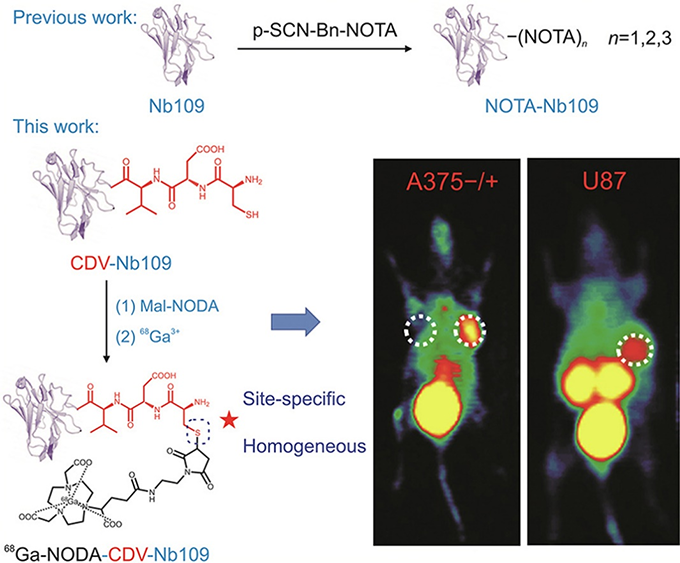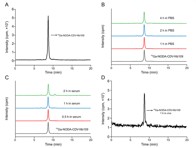 本研究试验是采用位点特异性放射性标记技术在68Ga-NOTA-Nb109结构上插入一个三肽序列(半胱氨酸、天冬氨酸和缬氨酸,即CDV),获得新的示踪剂68Ga-NODA-CDV-Nb109,并对其体内稳定性、靶向特异性、亲和力及药代动力学等做了全面系统的评估。