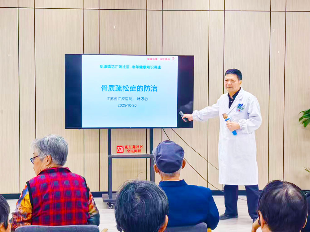 在胡埭社区卫生服务中心(花汇苑社区幸福家园)活动现场,骨质疏松科叶万忠主任以《原发性骨质疏松症的诊疗》为题开展科普讲座,用通俗易懂的语言从病因、危害、预防措施到治疗方法,系统讲解骨质疏松症相关知识,现场互动频繁、气氛活跃。讲座结束后,4位骨质疏松科专家组成咨询团队,为有需求的居民提供一对一免费健康咨询,针对腰背疼痛缓解、规范用药指导、康复训练方案等问题耐心解答,并结合居民身体状况给出个性化防治建议。同时,考虑到骨密度检测是早期发现骨质疏松风险的关键,专家们还为骨质疏松高危风险的居民发放免费骨密度筛查券,引导大家通过科学检测了解自身骨量情况,提前规避疾病风险。此次社区服务为居民提供了专业的健康指导,获得现场群众一致好评。