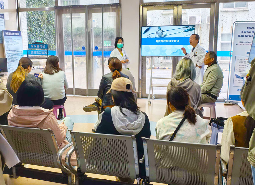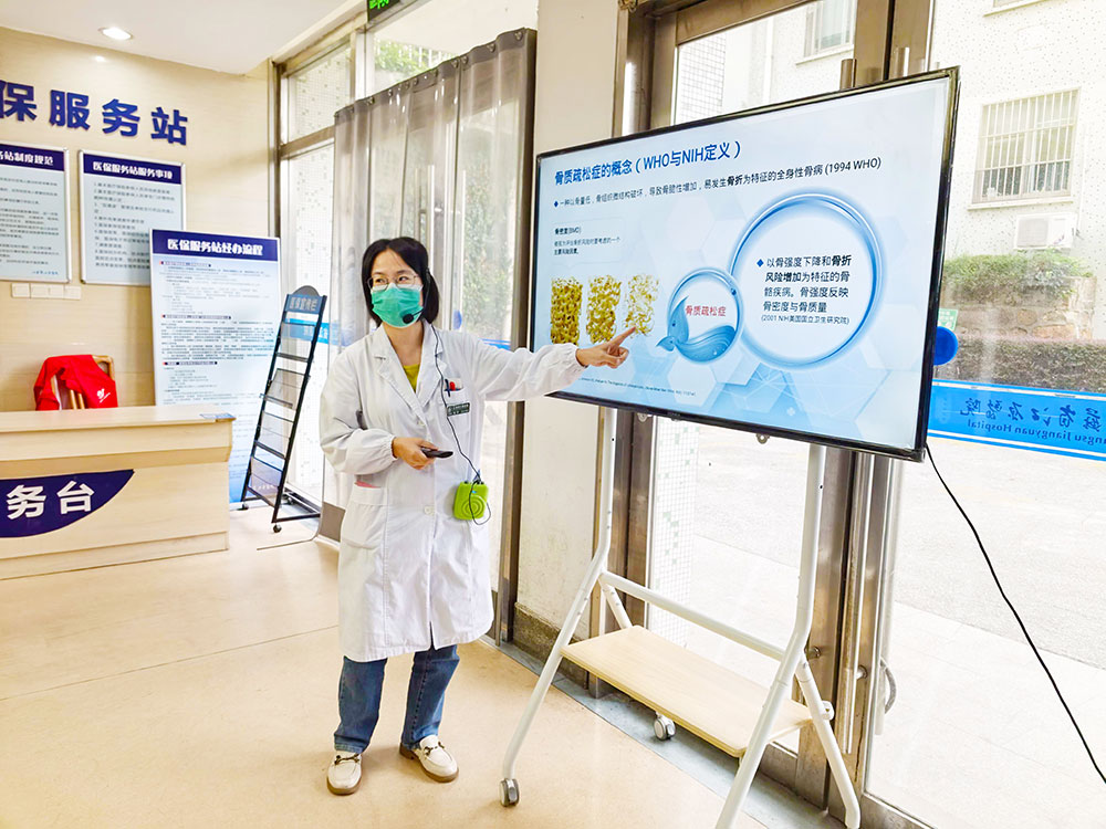 在江原医院门诊大厅,内分泌科潘懿副主任医师开展了《骨质疏松症的科普宣讲》移动宣教活动。她围绕骨质疏松症的典型症状、科学诊断方法、规范治疗原则及风险评估标准,为现场候诊患者及家属近距离讲解健康知识。院内移动宣教将健康科普灵活地融入就医场景,既提升了信息传播的精准度,又改善了患者及家属的就医体验。