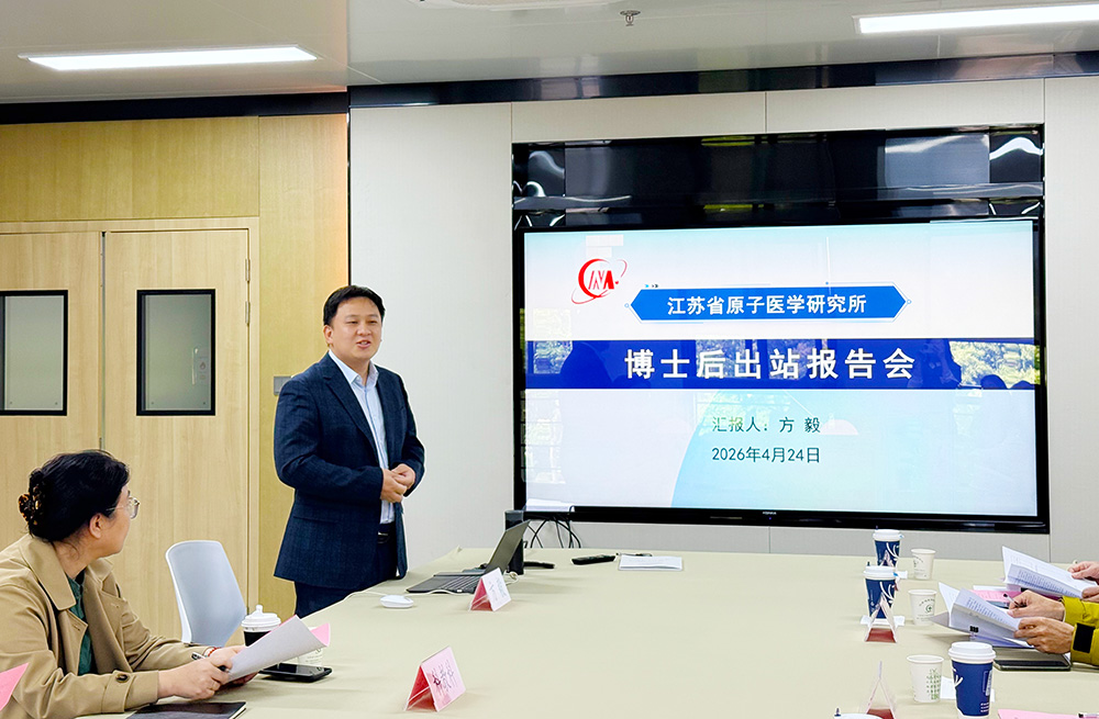 随后,滨湖区人社局周琳科长、南京医科大学蒋南副教授先后发言,对方毅博士的科研成果给予高度评价,充分肯定江苏省原子医学研究所博士后工作站在高层次人才培养、核医学前沿攻关方面的突出成效。杨敏副所长作总结发言,感谢各位专家与领导的专业指导,勉励方毅博士持续深耕核药学与分子影像领域,同时表示研究所将进一步完善博士后培养体系,强化科研创新与成果转化,为核医学领域人才成长与行业发展提供坚实支撑。
